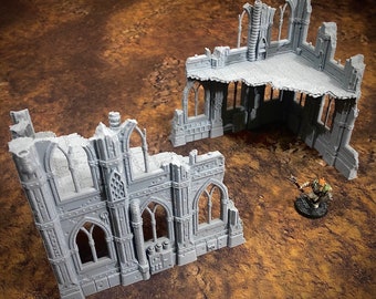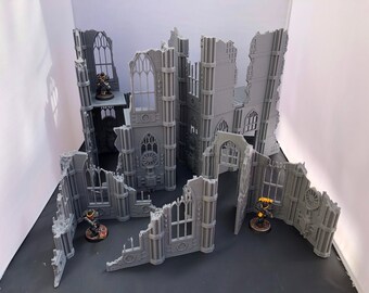 Large 3D Printed Bundle of Gothic Ruined Buildings Terrain for 28mm Tabletop Miniature Wargaming. Perfect for any futuristic setting such as Infinity WH40K Necromunda Kill Team Star Wars.
